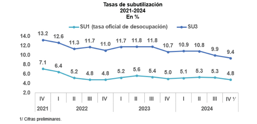 En cuanto a la tasa de subutilización de la fuerza de trabajo SU3, muy similar a la anteriormente conocida como tasa de desocupación ampliada, que toma en consideración tanto a los desocupados abiertos (buscando activamente trabajo) como a las personas que estarían dispuestas a trabajar aunque no estén buscando trabajo en la actualidad, presentó una disminución de 1.3 p.p., al pasar de 10.7 % en octubre-diciembre de 2023 a 9.4 % en igual período de 2024.