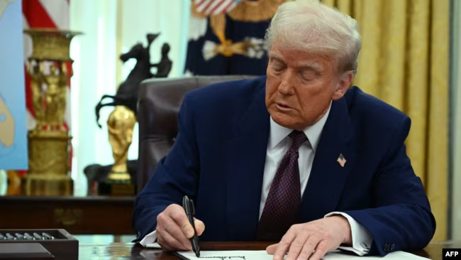 El presidente de Estados Unidos, Donald Trump, firma una Orden Ejecutiva sobre aranceles recíprocos en la Oficina Oval de la Casa Blanca en Washington, DC, el 13 de febrero de 2025.