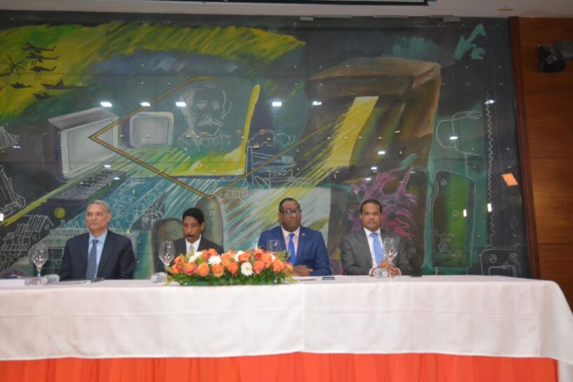 En la mesa directiva, del acto estuvieron el vicerrector de Investigación y Postgrado, maestro Radhamés Silverio González, el decano de Ciencias Económicas y Sociales, Antonio Ciriaco Cruz, el autor del libro maestro César Familia, y Guarionex Gómez, director de la Escuela de Estadísticas.