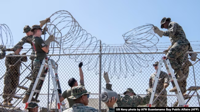 ARCHIVO: Marines de EEUU instalan alambres de púas en el Centro de Operaciones de Detención de Extranjeros Ilegales en la Bahía de Guantánamo, Cuba, el 8 de febrero de 2025. [Cortesía de la Marina de EEUU]