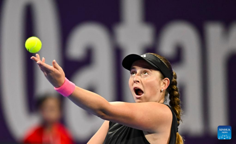 DOHA, 16 febrero, 2025 (Xinhua) — Imagen del 15 de febrero de 2025 de Jelena Ostapenko, de Letonia, sirviendo la pelota durante el partido final de individuales femeninos entre Jelena Ostapenko, de Letonia, y Amanda Anisimova, de Estados Unidos, en el torneo de tenis Abierto de Qatar de la WTA, en Doha, Qatar. (Xinhua/Nikku)
