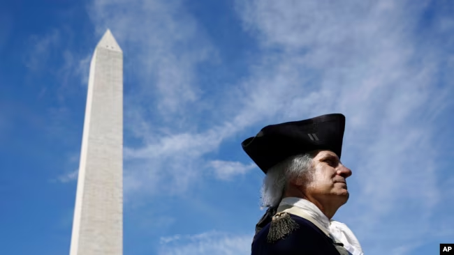 ARCHIVO – John Lopes, interpretando el papel del presidente George Washington, se encuentra cerca del Monumento a Washington después de una ceremonia de inauguración con la primera dama Melania Trump para reabrir el monumento, el 19 de septiembre de 2019, en Washington.