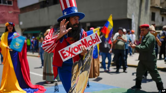 ARCHIVO – Un hombre vestido como el personaje estadounidense Tío Sam sostiene un cartel de la petrolera Exxon durante una marcha por el Esequibo, en Caracas, Venezuela, el 26 de septiembre de 2023.