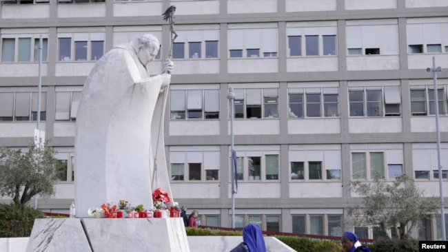 Una estatua del difunto Papa Juan Pablo II se encuentra afuera del Hospital Gemelli, donde el Papa Francisco ha ido para continuar el tratamiento de una bronquitis persistente en Roma, Italia, el 17 de febrero de 2025.
