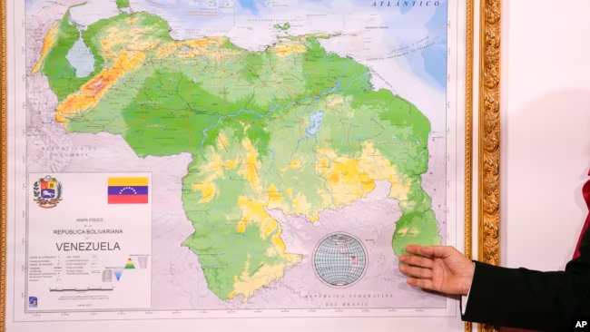 ARCHIVO – Esta imagen muestra el mapa de Esequibo, zona en disputa entre Venezuela y su vecino Guyana. La franja de tierra es administrada y controlada por Guyana, pero Venezuela la reclama como suya desde 2023.