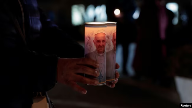 Una católica boliviana sostiene velas con la efigie del papa Francisco en el exterior del Hospital Gemelli de Roma, donde el pontífice está hospitalizado por una infeccción respiratoria, el 18 de febrero de 2025.