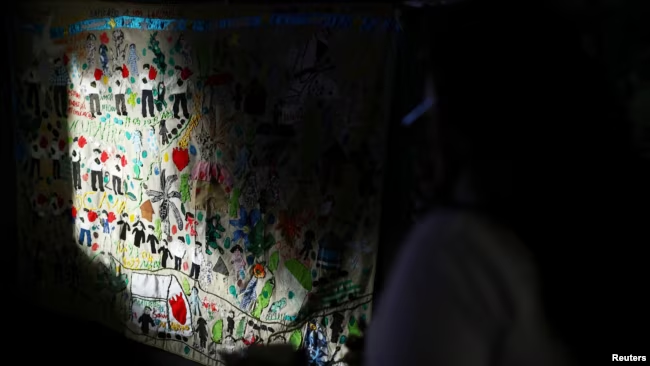 ARCHIVO: Una manta bordada por miembros de Madres de Falsos Positivos (MAFAPO) cuelga en una pared durante un homenaje realizado por la JEP a las víctimas de ejecuciones extrajudiciales llevadas a cabo por el ejército colombiano, en Bogotá, Colombia, el 28 de noviembre de 2024.