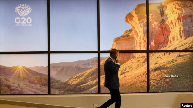 Un invitado pasa por una pantalla con el logotipo del G20, antes de una reunión de los ministros de Asuntos Exteriores del G20 organizada por Sudáfrica, bajo el tema «Solidaridad, Igualdad y Sostenibilidad», en Johannesburgo, Sudáfrica, el 20 de febrero de 2025. REUTERS