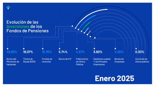 En julio del 2003, cuando inició el actual sistema de pensiones de capitalización individual, el 100% de los recursos de los fondos de pensiones se encontraba invertido en certificados de depósitos emitidos por las entidades de intermediación financiera. Al 31 de enero de 2025, estos recursos se encuentran distribuidos de la siguiente manera: 48.83% en bonos del Ministerio de Hacienda, 19.07% en títulos de deuda del Banco Central, 15.70% en fondos de inversión, 5.74% en bonos de entidades de intermediación financiera, 4.57% en fideicomisos de oferta pública, 3.80% en certificados financieros, 2.0% en bonos de empresas y 0.30% en acciones de oferta pública.