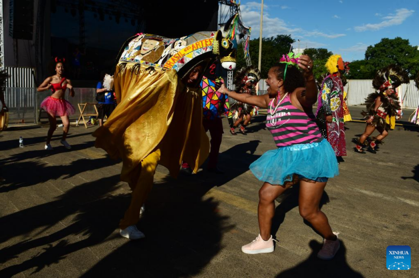 BRASILIA, 22 febrero, 2025 (Xinhua) — Integrantes de un bloque participan en una representación de la práctica ritual «Bumba meu boi» durante el comienzo del precarnaval, en Brasilia, Brasil, el 22 de febrero de 2025. (Xinhua/Lucio Tavora)