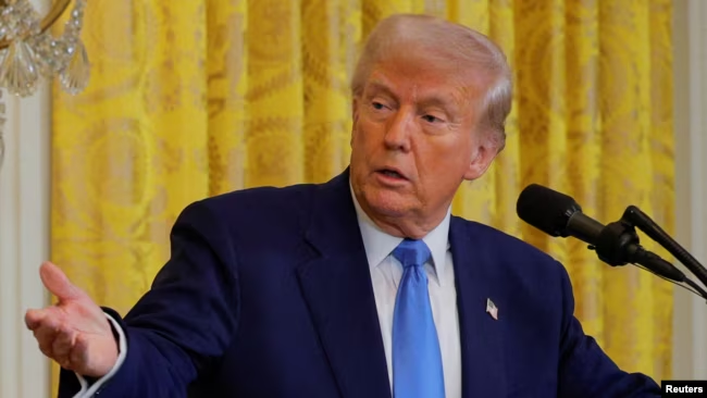 El presidente de Estados Unidos, Donald Trump, y el presidente francés, Emmanuel Macron (no en la foto) asisten a una conferencia de prensa en la Casa Blanca en Washington, EEUU, el 24 de febrero de 2025.