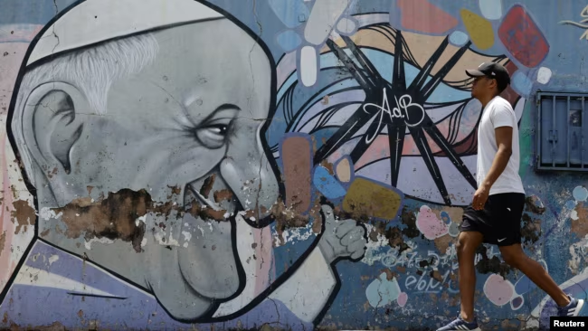 Un hombre pasa junto a un mural que representa al Papa Francisco, quien continúa hospitalizado. En Brasilia, Brasil, el 26 de febrero de 2025.