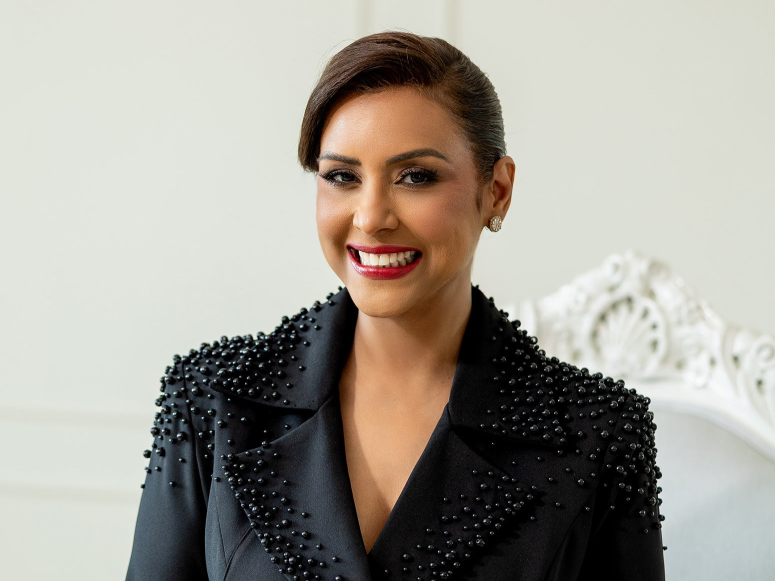 La diputada lució un exclusivo traje corte sastre de dos piezas y falda en color negro, con delicado tejido y bordado a mano con cientos de perlas negras. El vestuario elegido refleja la solemnidad del acto sin perder el sello de feminidad que caracteriza a la legisladora.