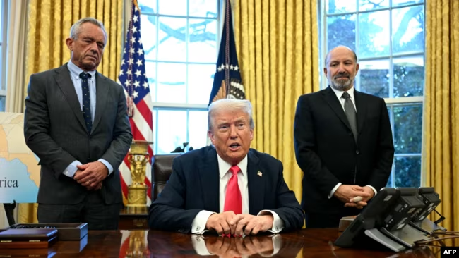 El presidente de EEUU, Donald Trump, habla con la prensa junto con el secretario de Salud y Servicios Humanos, Robert F. Kennedy Jr. (izq) y el secretario de Comercio, Howard Lutnick (der), en la Oficina Oval de la Casa Blanca, el 25 de febrero de 2025.