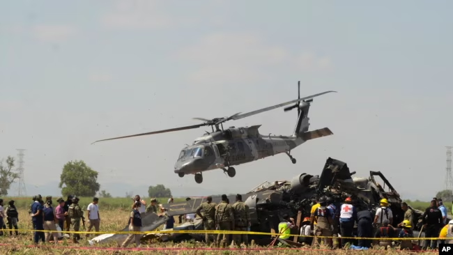 El personal de emergencia trabaja junto a un helicóptero Blackhawk de la marina que se estrelló después de apoyar a quienes llevaron a cabo la captura del narcotraficante Rafael Caro Quintero, cerca de Los Mochis, estado de Sinaloa, México, el viernes 15 de julio de 2022.