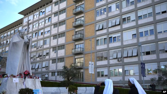 Monjas toman fotografías en el Policlínico Agostino Gemelli, en Roma, el viernes 28 de febrero de 2025, donde el papa Francisco se encuentra hospitalizado desde el viernes 14 de febrero.