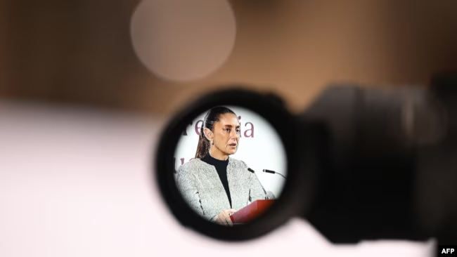 La presidenta de México, Claudia Sheinbaum, habla durante su conferencia de prensa diaria en el Palacio Nacional en la Ciudad de México el 28 de febrero de 2025.