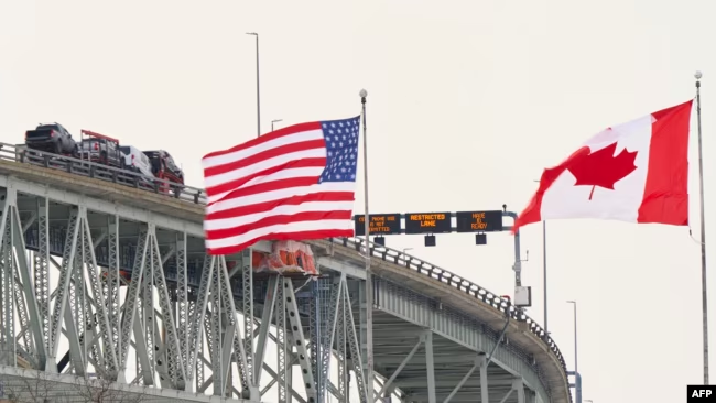Las banderas de Estados Unidos y Canadá ondean en el lado estadounidense del río St. Clair, cerca del cruce fronterizo del puente Bluewater entre Sarnia, Ontario y Port Huron, Michigan, el 29 de enero de 2025.