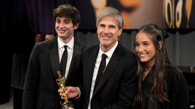 Vicente Salles, a la izquierda, Walter Salles, ganador del premio por «I’m Still Here» de Brasil, a mejor película internacional, y Helena Salles asisten al Governors Ball después de los Oscar el domingo 2 de marzo de 2025, en Los Ángeles. AP