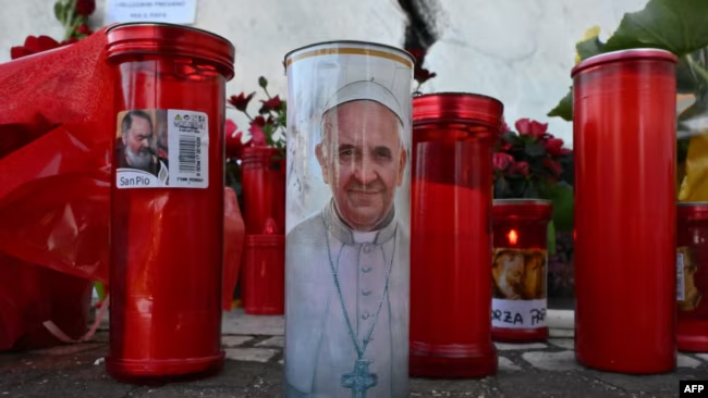 Se colocan velas en la estatua de Juan Pablo II afuera del Hospital Universitario Gemelli, donde el Papa Francisco está hospitalizado con neumonía, en Roma, el 3 de marzo de 2025.