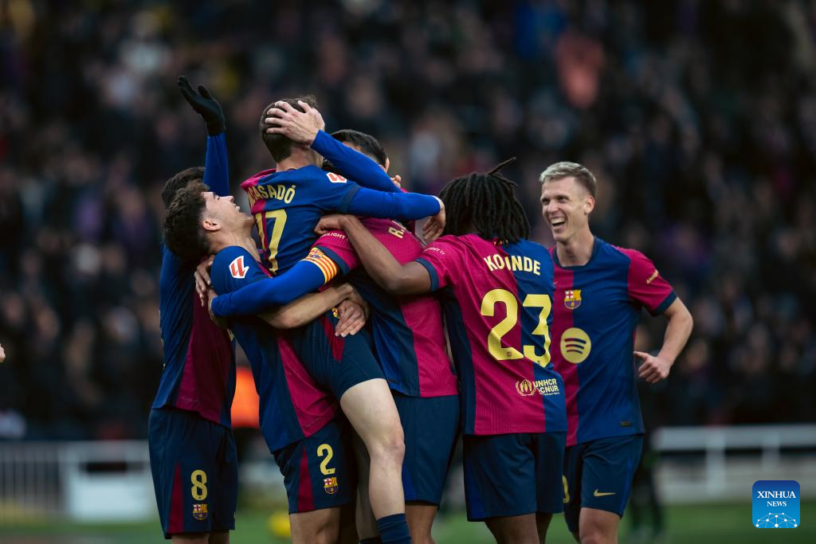 BARCELONA, 3 marzo, 2025 (Xinhua) — Imagen del 2 de marzo de 2025 de jugadores de FC Barcelona, festejando una anotación durante el partido de fútbol de LaLiga entre FC Barcelona y Real Sociedad, en el Estadio Olímpico Lluís Companys, en Barcelona, España. (Xinhua/Joan Gosa)