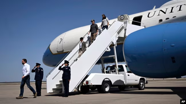 El vicepresidente JD Vance llega en el Air Force Two a la Base de la Fuerza Aérea Laughlin, Texas, para una visita a la frontera entre Estados Unidos y México el miércoles 5 de marzo de 2025.
