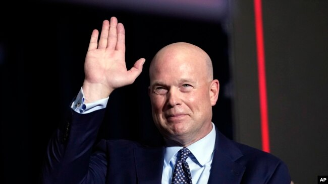 ARCHIVO – El ex fiscal general interino Matt Whitaker saluda mientras el candidato presidencial republicano y ex presidente Donald Trump habla en una fiesta nocturna de las asambleas partidarias en Des Moines, Iowa, el 15 de enero de 2024. AP