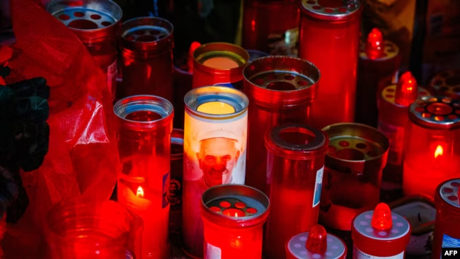 Velas encendidas frente a la estatua de Juan Pablo II en el exterior del hospital Gemelli de Roma, donde se encuentra ingresado en papa Francisco, el 5 de marzo de 2025.