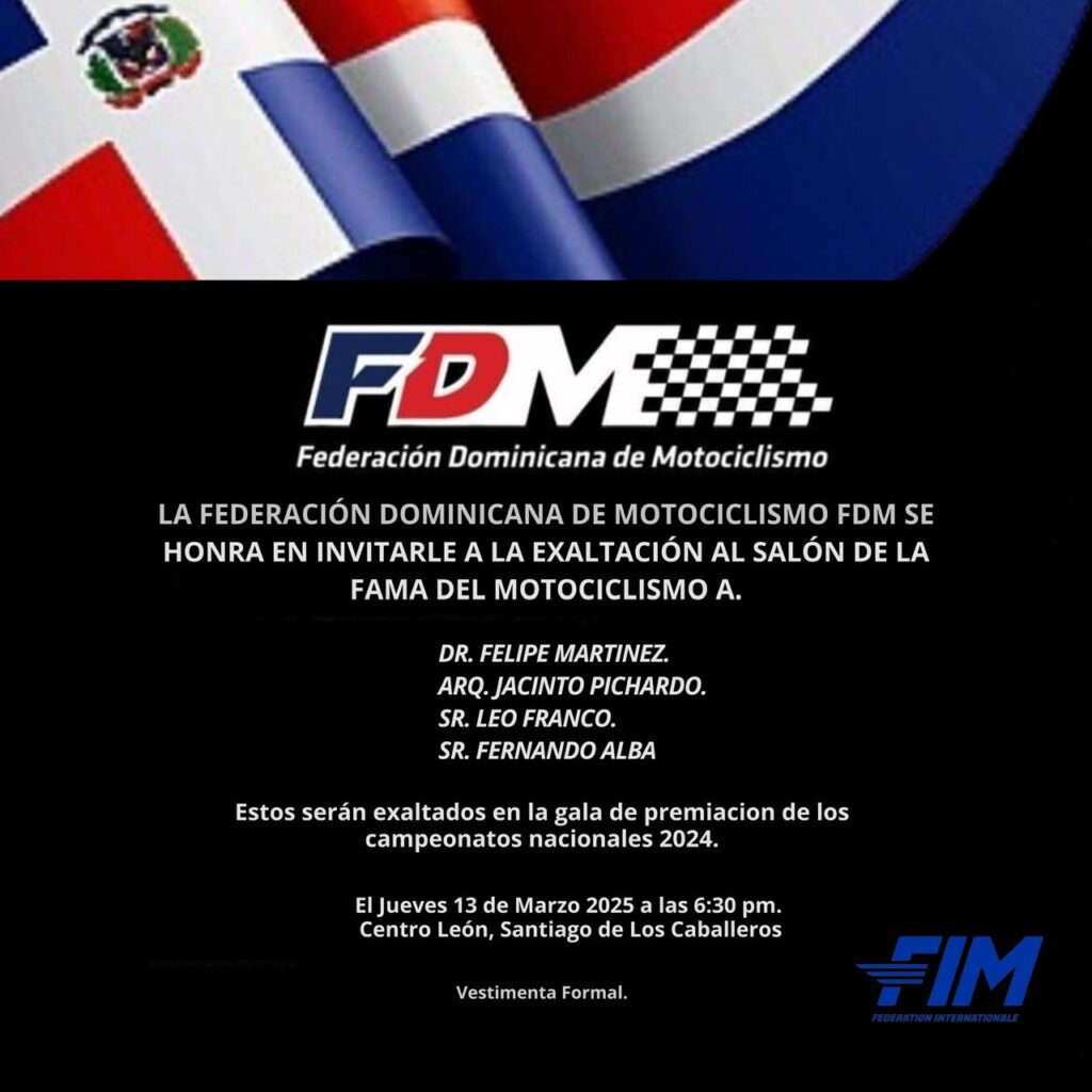 SANTIAGO DE LOS CABALLEROS, Santiago, República Dominicana (06-03-2025).- El próximo jueves 13 de marzo 2025 a las 6:30pm, teniendo como escenario el teatro del Centro León, la Federación Dominicana de Motociclismo (FDM) realizará la premiación anual de los campeonatos nacionales’2024 de motocross, motovelocidad, enduro y hard enduro, asimismo, exaltará a tres personalidades al Salón de la Fama de ese deporte.