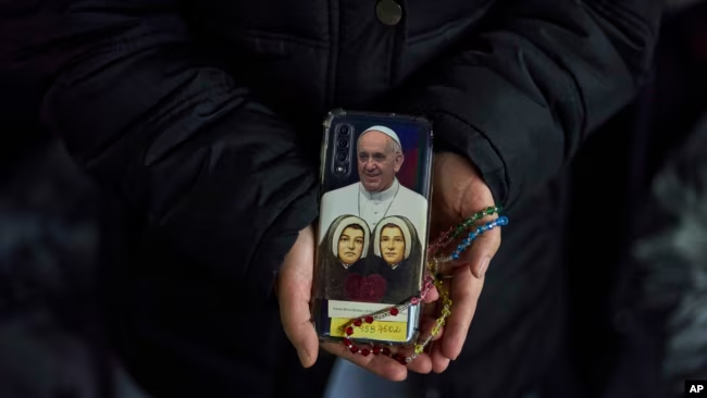 Una monja católica muestra la tapa trasera de su teléfono móvil con una fotografía del Papa Francisco mientras asiste a un servicio nocturno de oración del rosario por el Papa Francisco en la Plaza de San Pedro en el Vaticano, el 6 de marzo de 2025.