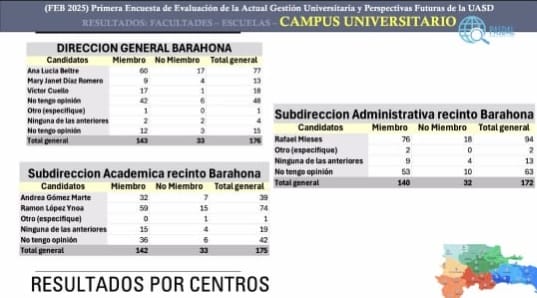 López Ynoa, que aspira a ocupar la Subdirección Académica de la UASD Recinto Barahona en las elecciones a celebrarse en el 2026, pero que desde ya está en actividades proselitistas, quedó en primer lugar con un amplio margen respecto a su más cercana contendora definiendo una tendencia clara de que será el ganador en las elecciones de 2026.