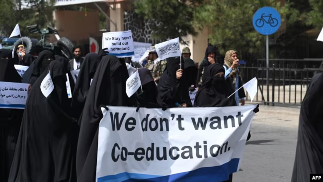 Mujeres cubiertas de la cabeza a los pies marchan por las calles de Kabul, Afganistán, el 11 de septiembre de 2021 en apoyo a las medidas del Talibán de no permitir la educación mixta.