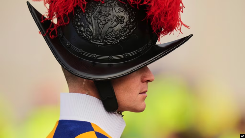 Un guardia suizo se ve de pie antes de una misa para voluntarios liderada por el cardenal Michael Czerny, delegado del papa Francisco en la plaza de San Pedro del Vaticano, el domingo 9 de marzo de 2025. (AP Foto/Francisco Seco).