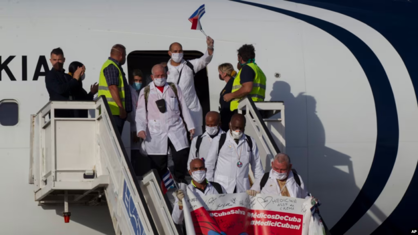 ARCHIVO – Médicos cubanos llegan al Aeropuerto Internacional José Martí en La Habana, Cuba, el 8 de junio de 2020, después de viajar a Italia para ayudar con la respuesta de emergencia COVID-19.