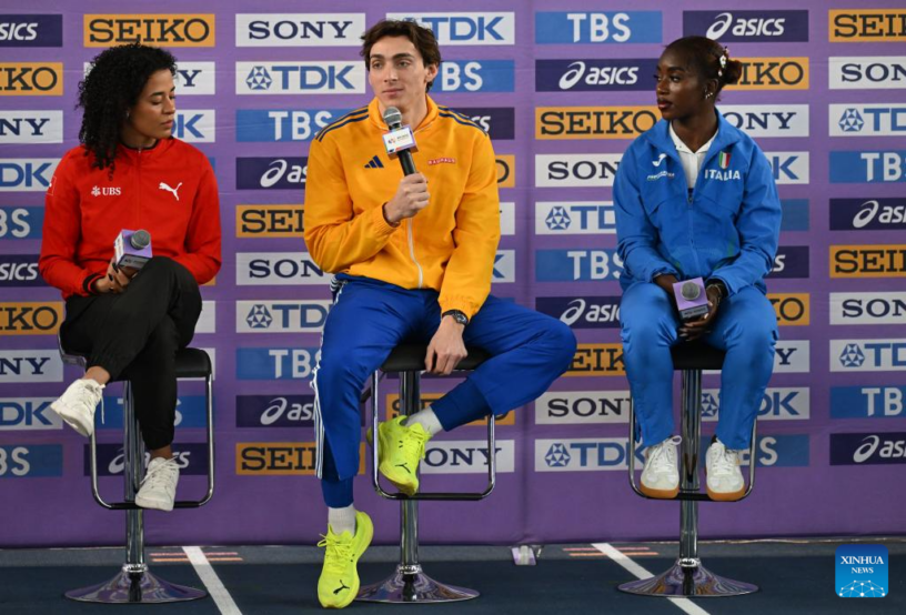 NANJING, 20 marzo, 2025 (Xinhua) — (De izq. a der.) Ditaji Kambundji, de Suiza, Mondo Duplantis, de Suecia, y Zaynab Dosso, de Italia, asisten a una conferencia de prensa para el Campeonato Mundial de Atletismo en Pista Cubierta, en Nanjing, en la provincia de Jiangsu, en el este de China, el 20 de marzo de 2025. (Xinhua/Song Yanhua)