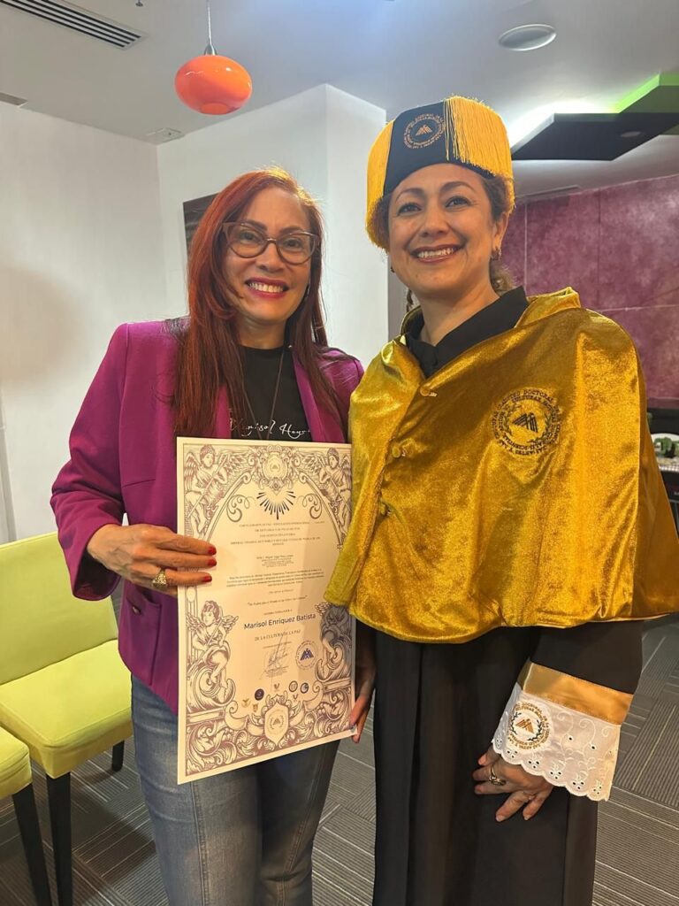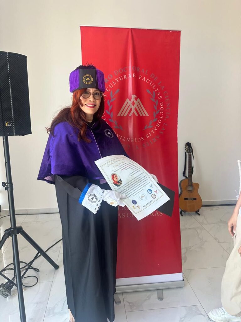 En este evento la destacada diseñadora fue galardonada con los siguientes reconocimientos Doctorado Honoris Causa de La Ciencia, Las Artes y Las Culturas, y Embajadora de la Cultura y de la Paz por parte de la Facultad Doctoralis Scientiae Artiumet Culturae, los cuales fueron entregados por su presidente fundador Dr. Miguel Ángel Pérez Leonor.