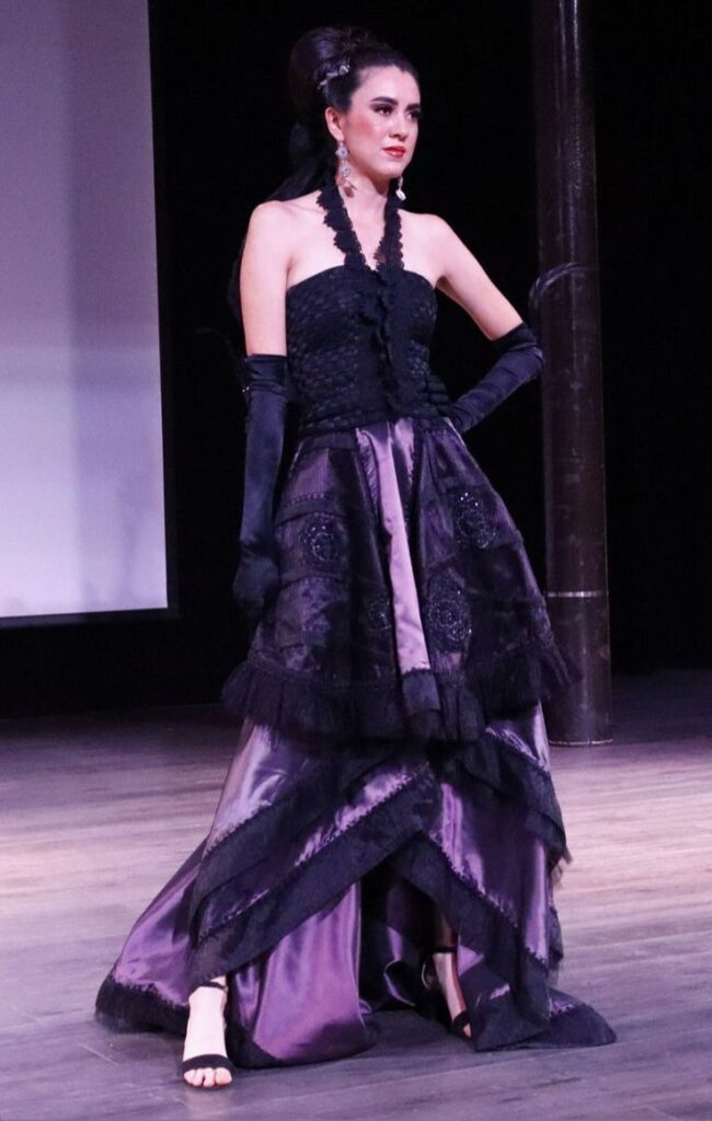 Mientras que ‘Esplendor de María’ es un vestido, dedicado a la icónica actriz dominicana María Montez, que refleja el glamour clásico de Hollywood con un diseño que combina cintas de seda entrelazadas, vibrantes lentejuelas y delicados encajes. Las transparencias estratégicas y los detalles románticos evocan la opulencia y la majestuosidad de la época dorada del cine.