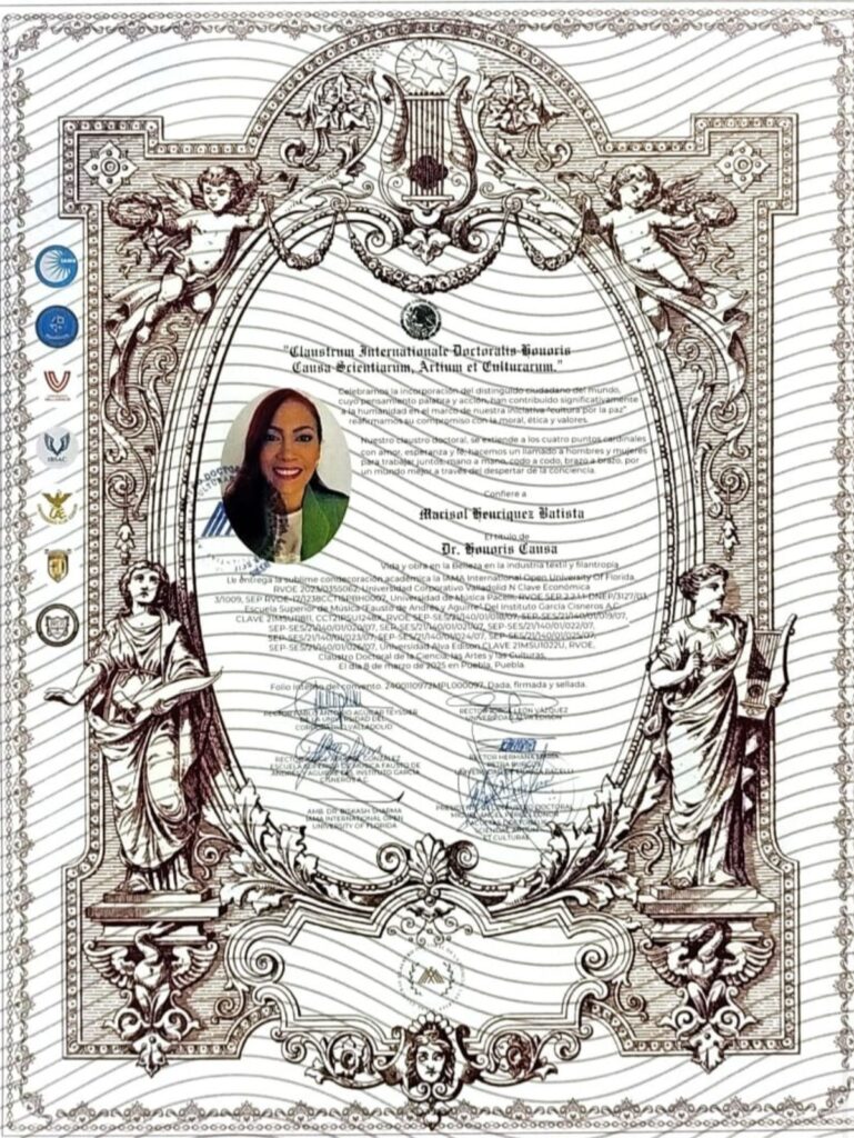 Fue galardonada con los siguientes reconocimientos Doctorado Honoris Causa de La Ciencia, Las Artes y Las Culturas, y Embajadora de la Cultura y de la Paz por parte de la Facultad Doctoralis Scientiae Artiumet Culturae,