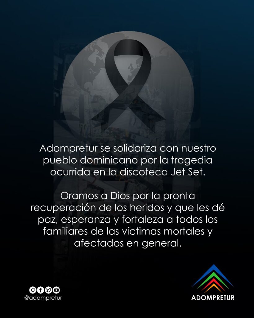 Santo Domingo, martes 8 de abril de 2025. La Asociación Dominicana de Prensa Turística (Adompretur) expresa su más profundo pesar por la tragedia ocurrida en la madrugada de este martes 8 de abril en la discoteca Jet Set, donde el colapso de su techo dejó un saldo trágico de cientos de heridos y al menos una veintena de víctimas mortales.