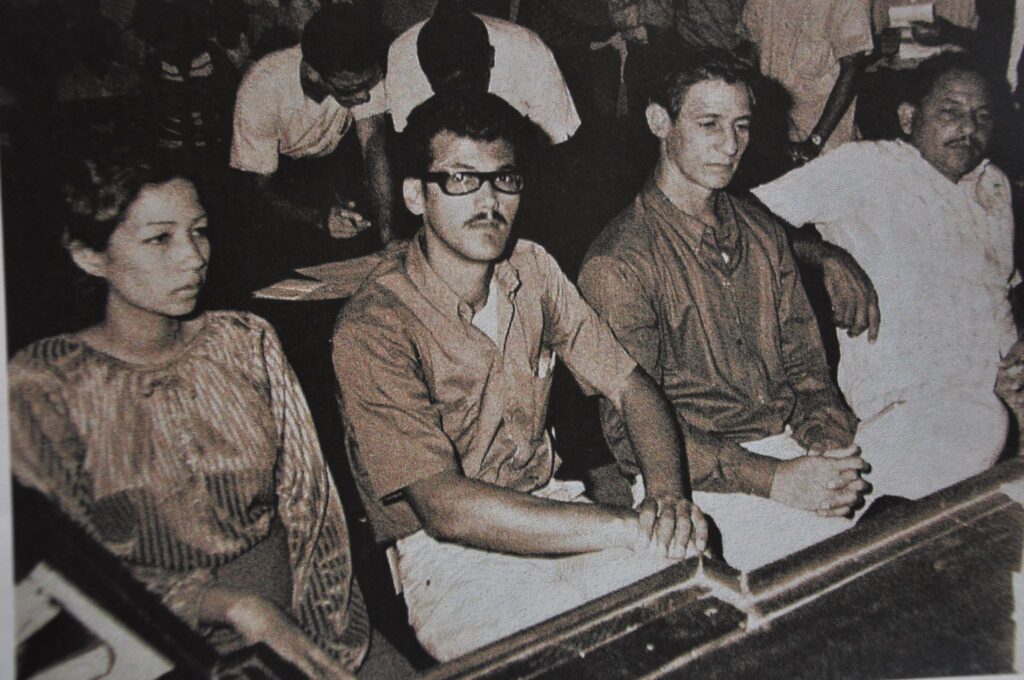 En el extremo derecho, el comandante de Abril Eligio Antonio Blanco Peña, en un tribunal del Palacio de Justicia de Ciudad Nueva, acusado de conspirar contra el gobierno del dictador Joaquín Balaguer. Con lentes y bigote, Chino Bujosa, Román y Lourdes González, estudiante de la UASD. (Foto: Archivo José y Sagrada Bujosa Mieses)