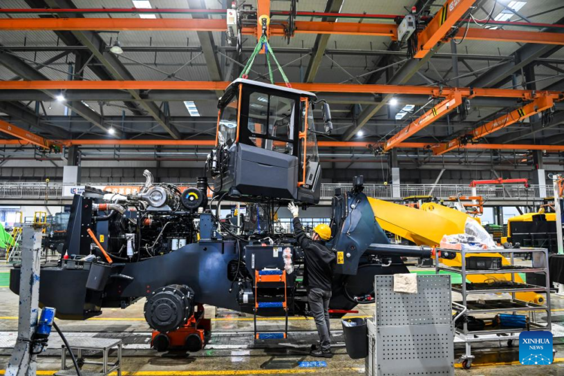 NANNING, 22 abril, 2025 (Xinhua) — Imagen del 11 de marzo de 2025 de un trabajador laborando en una línea de producción de retroexcavadoras en una empresa de fabricación de equipamiento, en Liuzhou, en la región autónoma de la etnia zhuang de Guangxi, en el sur de China. Inaugurado en 2017, el Nuevo Corredor Comercial Internacional Tierra-Mar es una vía comercial y logística construida conjuntamente por las regiones a nivel provincial del oeste de China y los países miembros de la ASEAN. (Xinhua/Cao Yiming)
