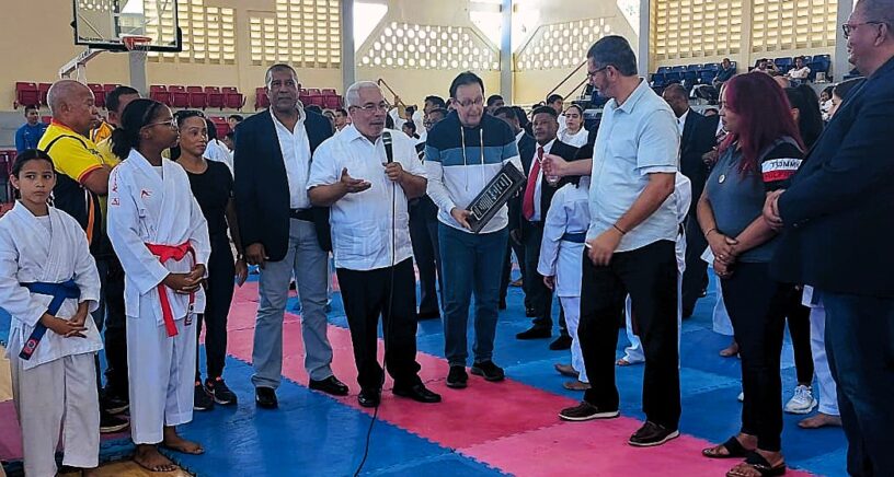 2- El presidente de la Federación Dominicana de Karate, sensei José Luís Ramírez, entrega una placa de reconocimiento al sensei Fausto Genao, junto al presidente de la Asociación de Karate de Santiago, sensei Severiano Rosa y el representante de UDESA, Emmanuel García Musa, entre otras personalidades