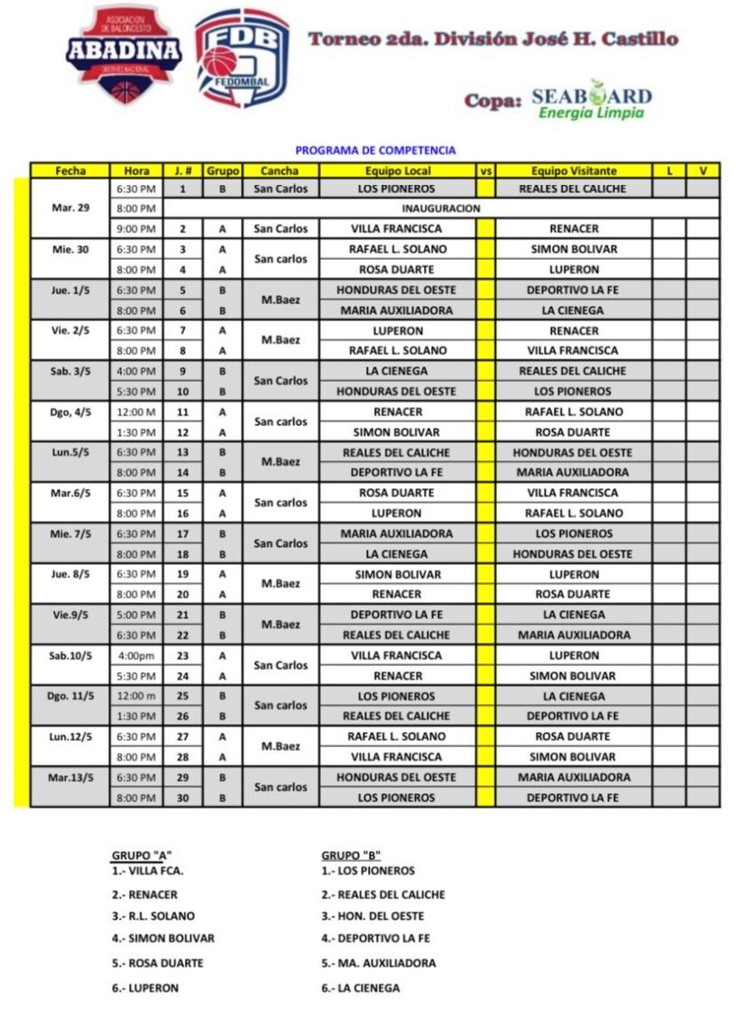 SANTO DOMINGO, RD.- La Asociación de Baloncesto del Distrito Nacional (Abadina) inició este martes el III Torneo de Segunda División José Heredia Castillo (Corporancito), en una jornada de dos partidos efectuada en el polideportivo del club San Carlos.