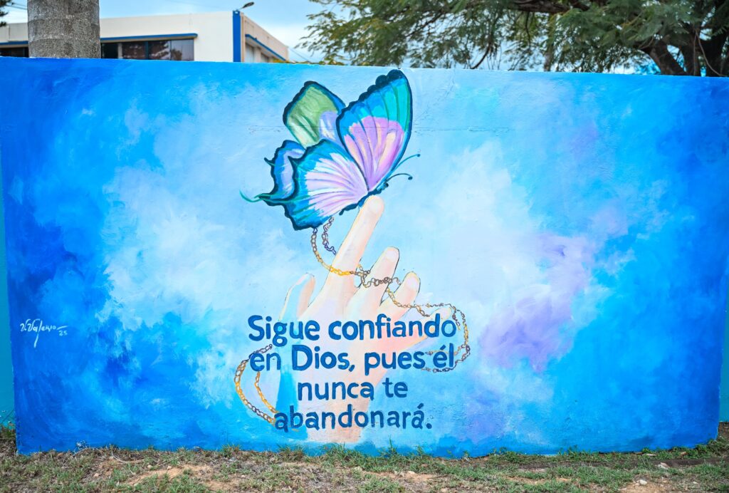 El mural incluye símbolos de la fe cristiana, como la Santa Biblia y representaciones del amor a Dios, reafirmando el compromiso de la actual gestión municipal con el arte, la espiritualidad y la recuperación de espacios públicos para el fortalecimiento de la identidad cultural de la ciudad.