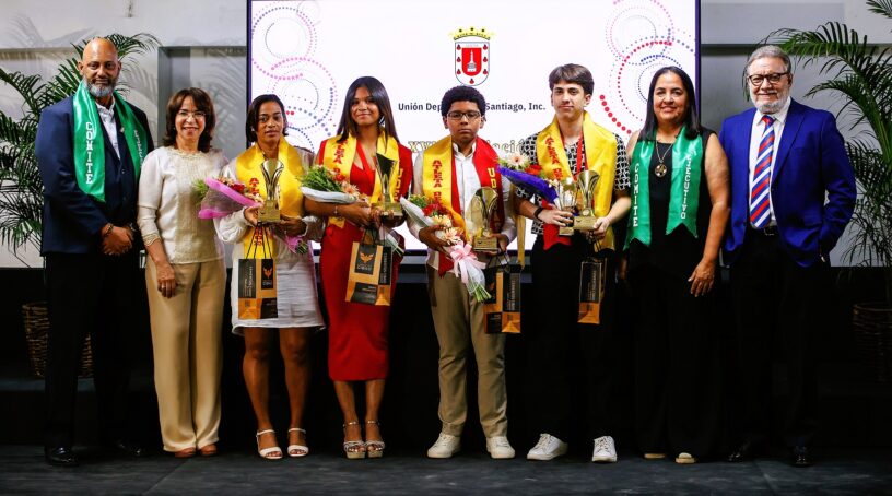Los atletas más destacados del año 2024 en Santiago, Joely Martínez (Taekwondo), Sahiean Polanco Fernández (Ajedrez), Gillian Peña Martínez (Atletismo) y Ramón Vila (Tenis de Mesa), junto a quienes entregaron los galardones del XVI Premio Infantil y Juvenil, Rafael -Panchón- Tejada, en el extremo izquierdo, Osvaldo Arzola, secretario de UDESA y la doctora Mariana Moreno, vice alcaldesa de Santiago, en el derecho, Margarita. Jáquez, presidente de UDESA y Guillermo José Saleta Pérez, presidente Advitam de esa entidad