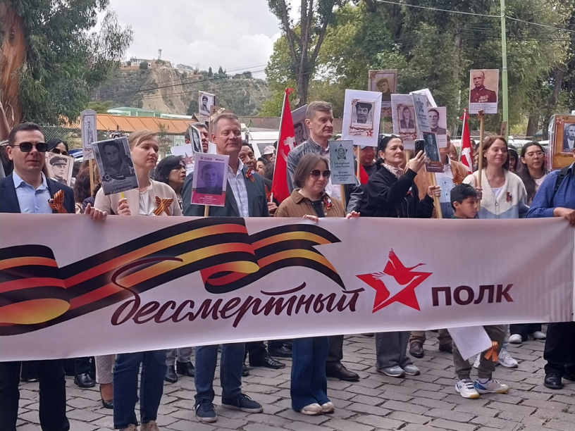 Funcionarios de esa misión, profesores y alumnos del Colegio Ruso-Boliviano, así como miembros de la Asociación de Egresados en la Unión Soviética y activistas antifascistas desfilaron con retratos y uniformes de combatientes del Ejército Rojo hasta la tarja que, en la fachada de la embajada recuerda esa epopeya, donde depositaron ofrendas florales.