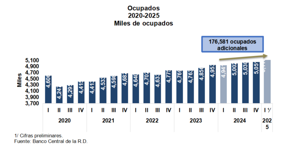 En el primer trimestre de 2025 el total de ocupados de la economía dominicana (incluyendo los formales e informales) se ubicó en 5,117,548 trabajadores, para un incremento de 176,581 nuevos ocupados netos al comparar con respecto a enero-marzo de 2024. Con este resultado, la tasa de ocupación (TO), definida como la relación entre el total de ocupados y la población en edad de trabajar (PET), se situó en 62.8 % en enero-marzo de 2025, siendo la cifra más alta en la serie de este indicador, superior en 1.2 p.p. respecto a la tasa del primer trimestre del año 2024.