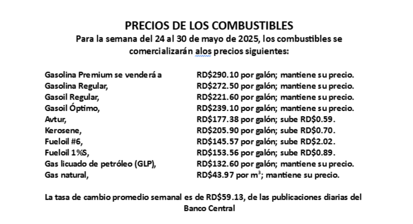 Santo Domingo, D. N.- El viceministro de Comercio Interno del Ministerio de Industria, Comercio y Mipymes (MICM), Ramón Pérez Fermín, informó que, solo para la semana del 24 al 30 de mayo de 2025, el Gobierno dominicano dispuso mantener sin variación los precios de los combustibles esenciale.