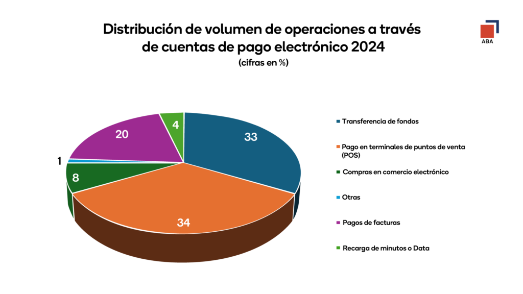 Expuso que las cuentas de pago electrónico se utilizan principalmente para transferencia de fondos, pago en terminales de puntos de venta (POS), compras en comercio electrónico, retiros en cajeros automáticos, pagos de facturas, recarga de minutos o datos.