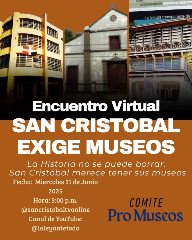 San Cristóbal, R. D., 6 de junio, 2025.- El Comité Pro Museos de San Cristóbal, un movimiento cívico comprometido con la preservación y difusión del patrimonio histórico de la provincia, anuncia la celebración de un Encuentro Virtual bajo el lema «San Cristóbal Exige Museos». Este evento crucial tiene como objetivo principal demandar la inmediata restauración de la histórica Casa Caoba para su conversión en museo, así como la creación de otros espacios museísticos que permitan salvaguardar y exhibir la vasta riqueza histórica de San Cristóbal.